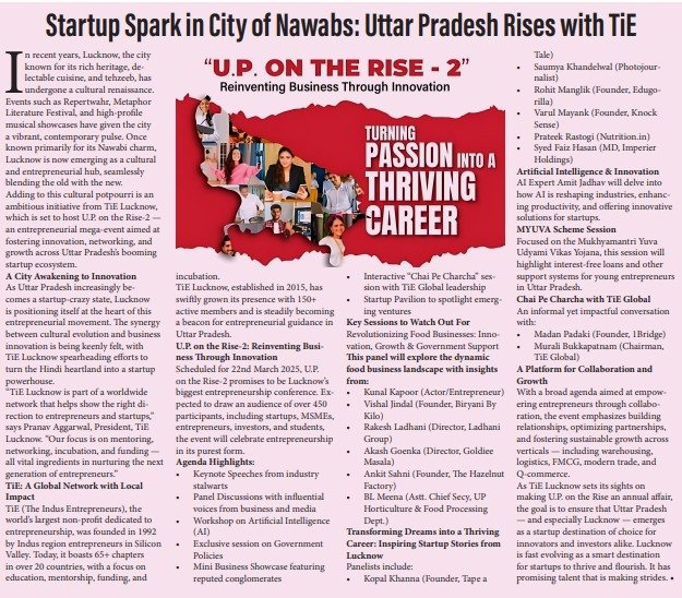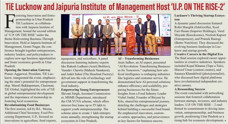 TiE Lucknow continues to gain strong visibility across leading print, digital, and broadcast media platforms. Our initiatives and events are being regularly featured, highlighting TiE Lucknow’s growing impact on entrepreneurship, startups, and the regional business ecosystem.